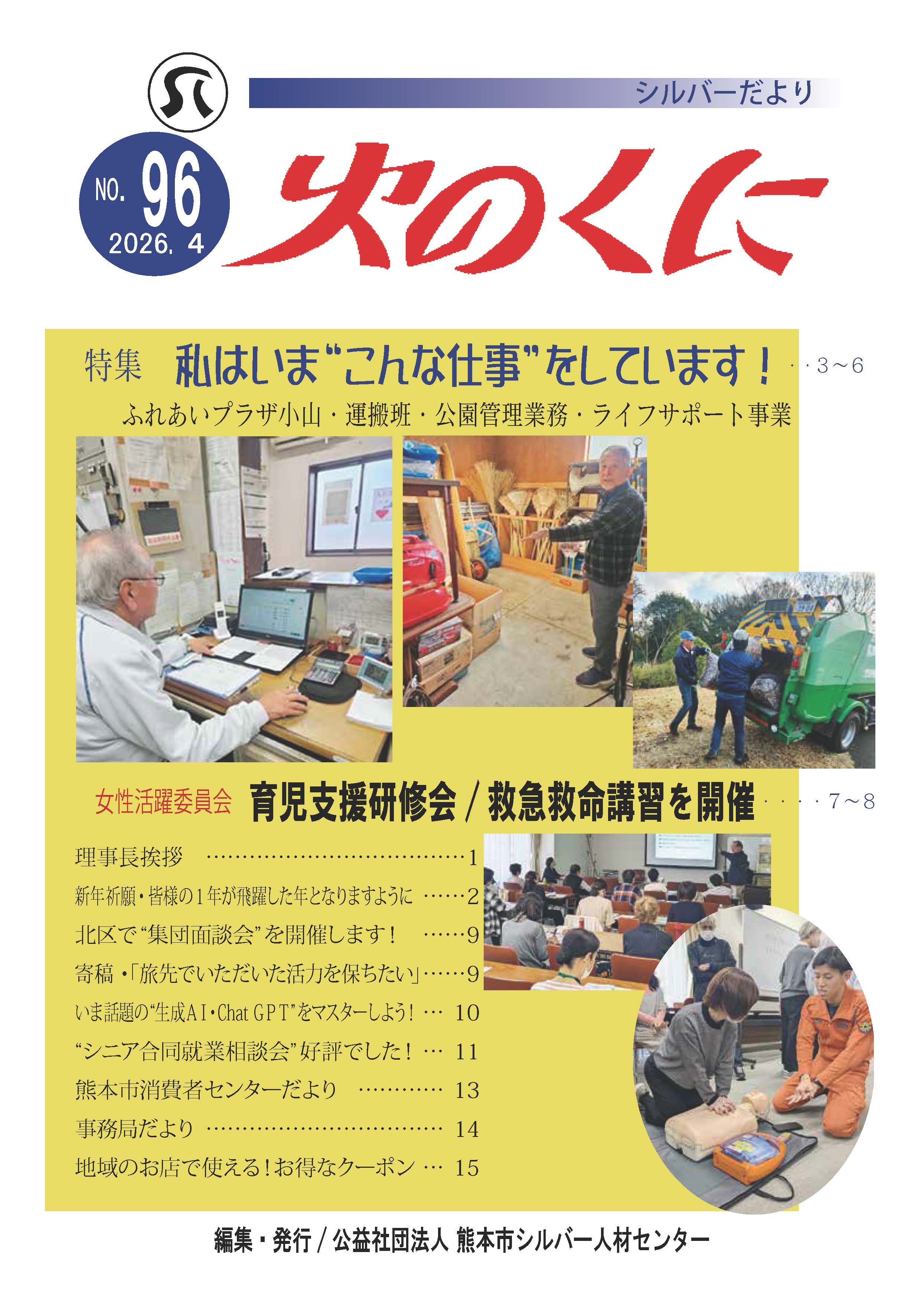 会員の皆さんへ発行しているシルバーだより「会報火のくに」をパソコンやスマートフォンでご覧いただけます。イベント情報をはじめ様々な情報をお届けいたします。
